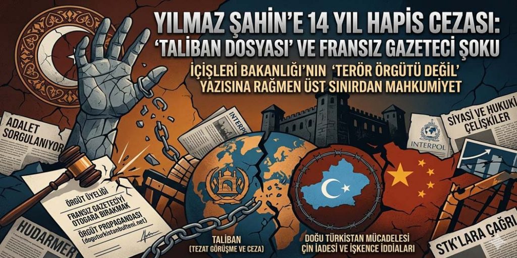 Türkistan İslam Derneği Başkanı Yılmaz Şahin, Ankara 6. Ağır Ceza Mahkemesi’nde görülen davada iki ayrı suçlamadan toplam 14 yıl hapis cezasına çarptırıldı. 2010 yılından bu yana süregelen ve kamuoyunda “Taliban dosyası” olarak bilinen davada çıkan karar, İçişleri Bakanlığı’nın görüş yazısıyla çeliştiği iddiasıyla tartışmalara yol açtı.